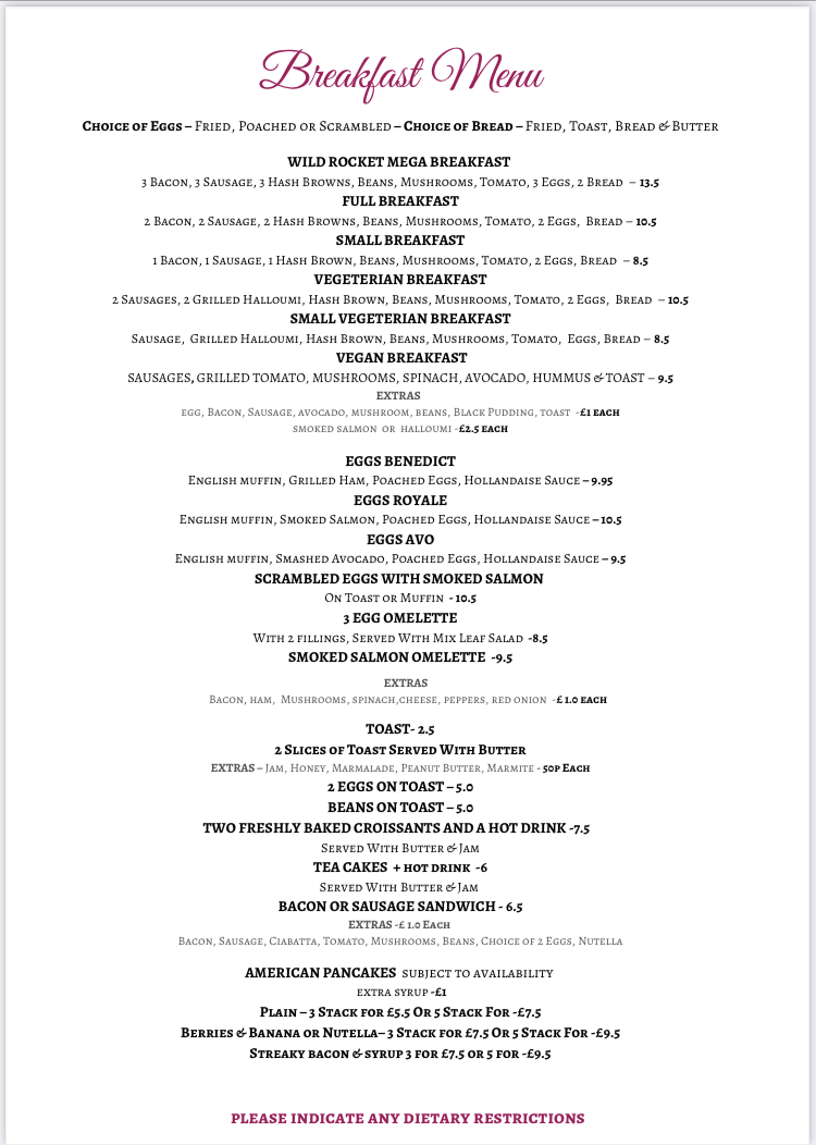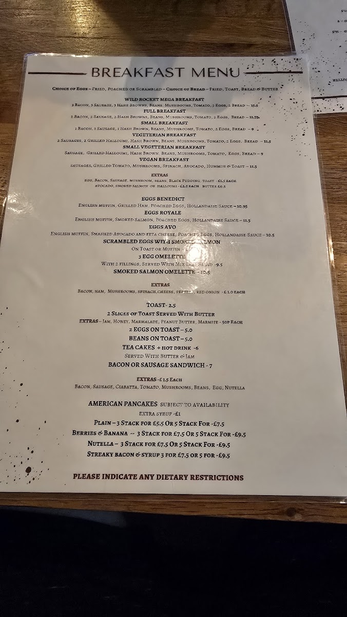 Welcome to Wild Rocket, a culinary gem nestled in Bridgwater at 18 High St. This inviting restaurant is known for its superb food, friendly service, and vibrant atmosphere. Guests rave about the variety on the menu, from hearty breakfasts to delightful evening meals. Signature dishes include a fulfilling full English breakfast and beautifully presented dinners that showcase fresh, local ingredients.